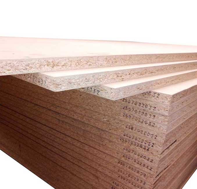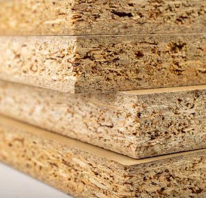 Tablero elaborado de un material compuesto fabricado a partir de pequeñas partículas de madera prensadas y unidas con resinas sintéticas mediante calor y presión.